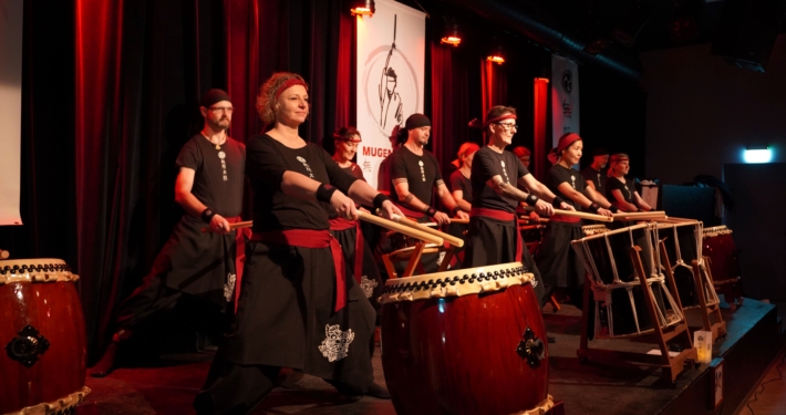 In Kooperation mit dem Budokan Mülheim e.V. unterrichten wir das traditionelle japanische Trommeln (Wadaiko) im Mugen Dojo und der Luisenschule in Mülheim a.d. Ruhr.